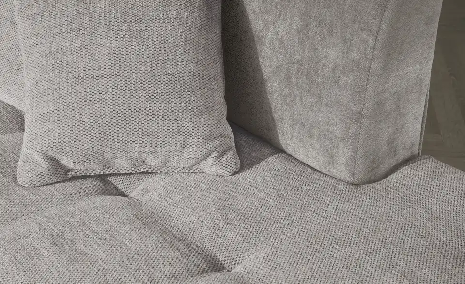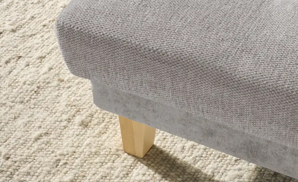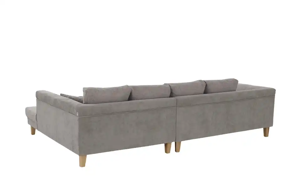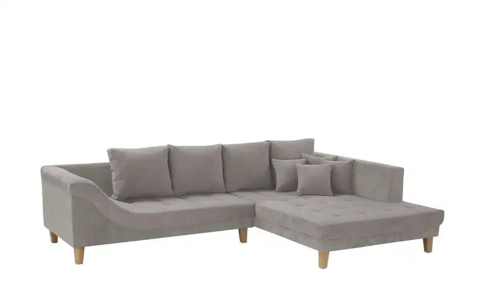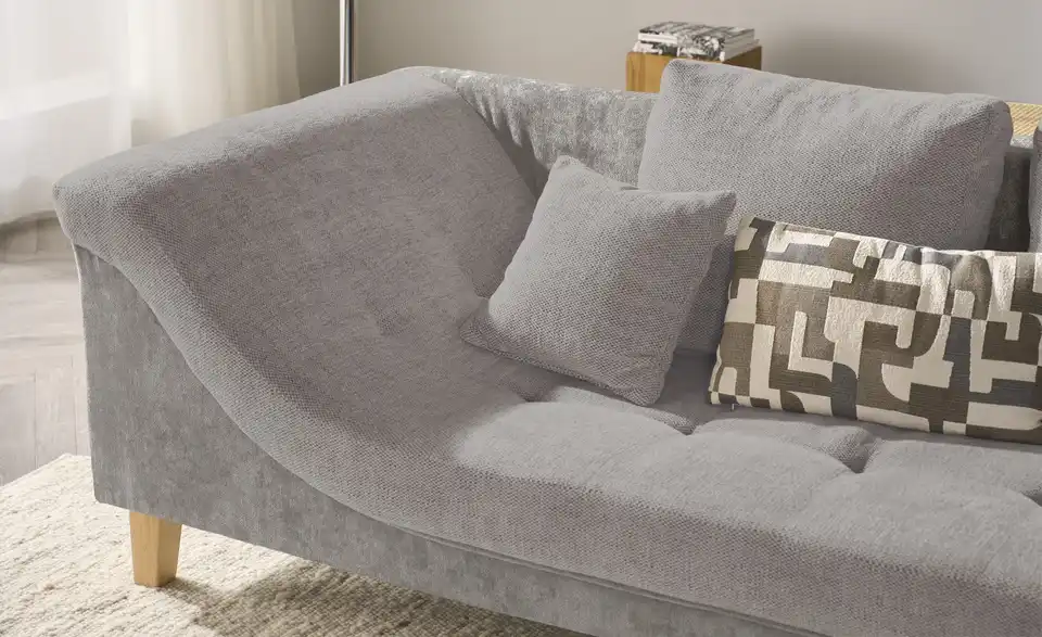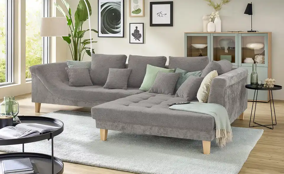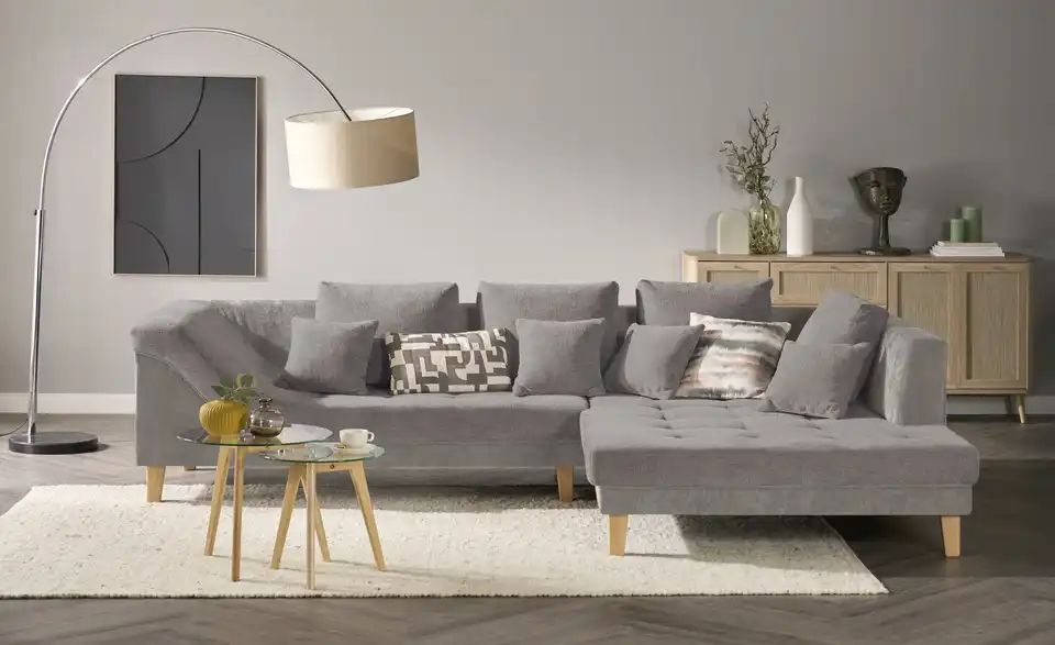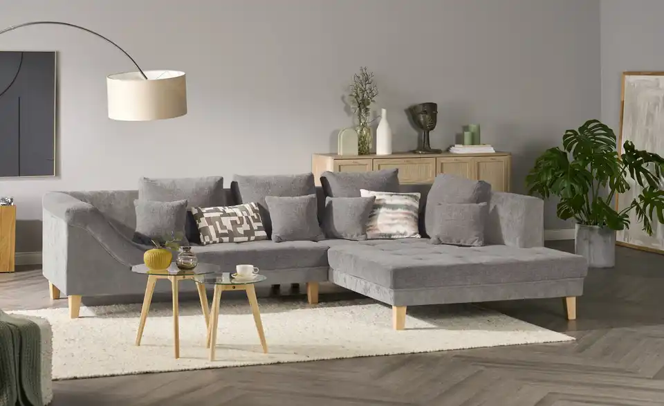 Dieses Ecksofa überzeugt durch beste Komforteigenschaften und einem attraktiven, zeitlosen Design. Ein pflegeleichter, kombinationsfreudiger Stoff umspannt das ganze Sofa, sodass Sie es auch problemlos mittig im Raum oder als Raumtrenner platzieren können. Machen Sie es sich bequem und strecken Sie sich auf der Ottomane aus. Eine geschwungene Armlehne und vier mitgelieferte Zierkissen sorgen für Gemütlichkeit. Für einen individuellen Touch ergänzen Sie das Sofa einfach mit eigenen Dekokissen und -Decken.Lieferung & Versand