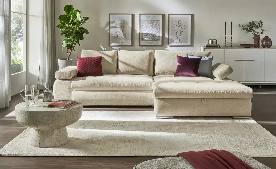 Das Ecksofa Ibby mit seiner weitläufigen L-Form bietet viel Platz zum Entspannen und Erholen. Die Sitzfläche ist mit einer Wellenunterfederung ausgestattet. Darauf befindet sich eine Polsterung aus Schaumstoff, die sich auch im Rückenbereich und den Armlehnen wiederfindet. Somit ist ein angenehmes Sitzen und Liegen gewährleistet. Für noch mehr Komfort sind drei Rückenkissen im Lieferumfang enthalten. Die Armlehnen lassen sich individuell verstellen. Ein weiteres Highlight von Ibby ist die Schlaffunktion: Ziehen Sie Ibby einfach zum Gästebett aus. Im großzügigen Bettkasten unter der Sitzfläche können Sie zum Beispiel Bettwäsche für den Besuch verstauen. Ibby ist rundum mit einem einfarbigen Stoff bezogen. So können Sie Ibby auch frei in den Wohnraum stellen. Wählen Sie aus verschiedenen strapazierfähigen Stoffbezügen und bestimmen Sie die Gestaltung Ihres Sofas ganz einfach selbst.Lieferung & Versand