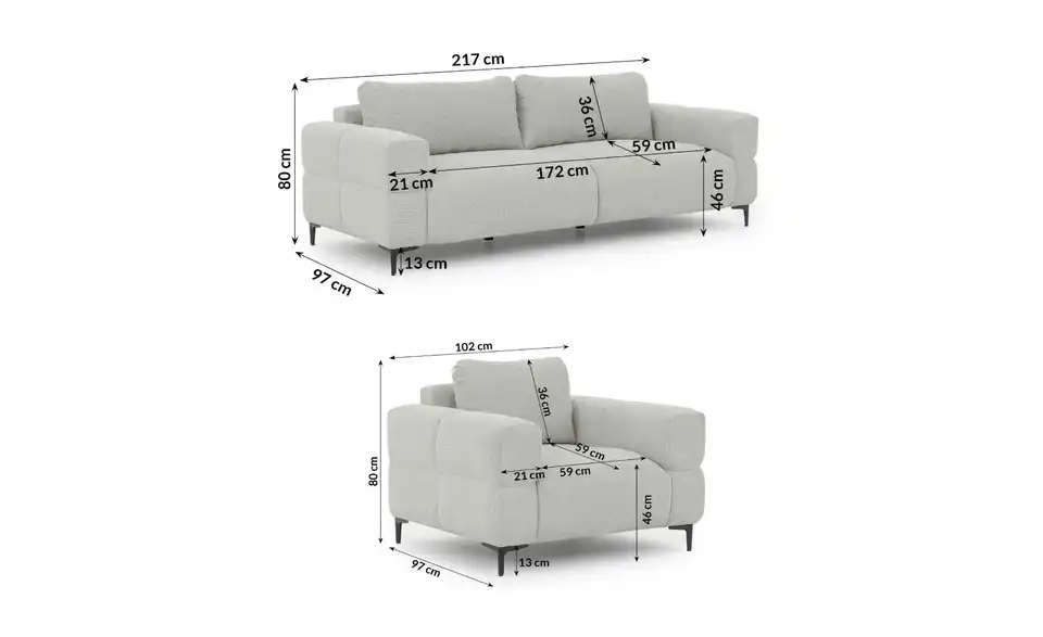 - Mehr zu MaßenSitzbreite - 3-Sitzer 172 cm; Sessel 59 cm