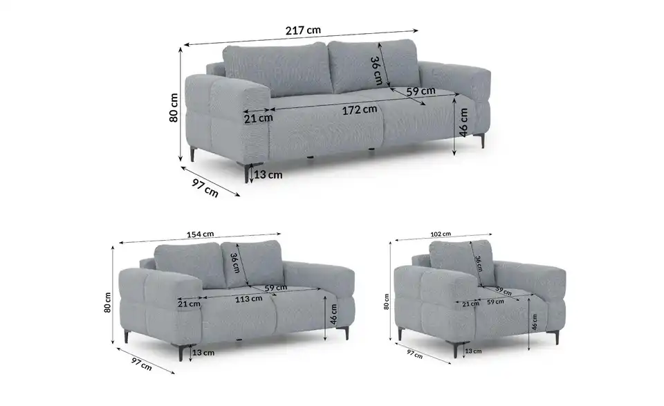 - Mehr zu MaßenSitzbreite - 3-Sitzer 172 cm; 2-Sitzer: 113 cm; Sessel 59 cm