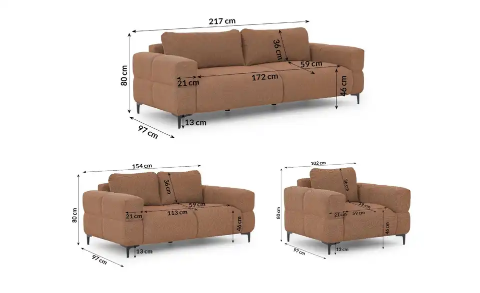 - Mehr zu MaßenSitzbreite - 3-Sitzer 172 cm; 2-Sitzer: 113 cm; Sessel 59 cm