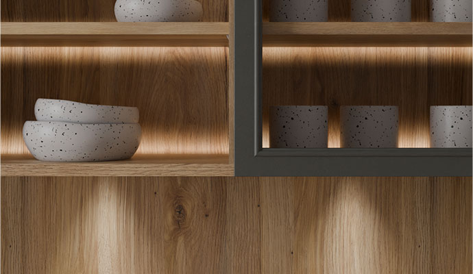 Wählen Sie die Möbel Ton-in-Ton oder kombinieren Sie die Farbvarianten miteinander. Besonders hübsch: Mit der passenden Beleuchtung – separat erhältlich – können Sie Vitrinenfächer schick in Szene setzten und so Ihr Lieblings-Deko gekonnt in den Fokus rücken.