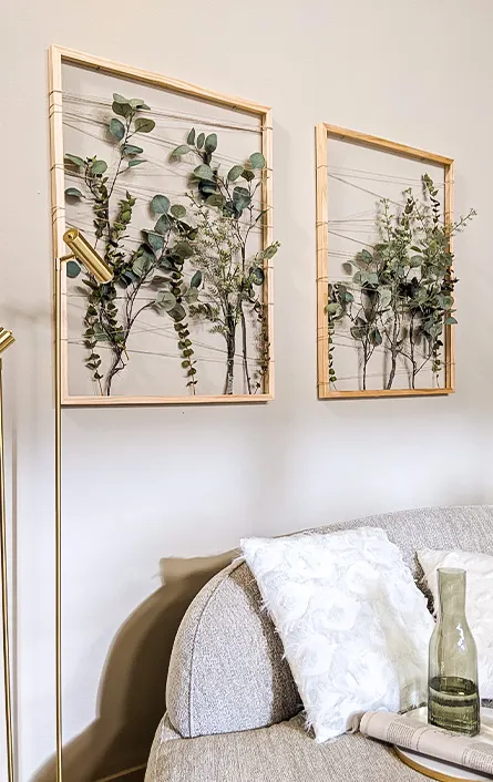 Nun ist euer Fingerspitzen-Gefühl gefragt. Fädelt Pflanzen wie zum Beispiel Eukalyptusstiele zwischen die einzelnen Bänder. Sie werden so gestützt und ihr könnt frei entscheiden, wie groß das Blumenmeer in eurem Rahmen sein soll. Selbstverständlich könnt ihr hier auch andere Dinge wie Fotos oder Postkarten zwischen klemmen. Eurer Kreativität sind keine Grenzen gesetzt!