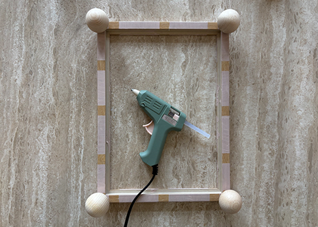 Befestigen Sie nun die Füße mithilfe der Heißklebepistole. Achten Sie darauf, diese so zu platzieren, dass Sie das Glas und das Bild später problemlos wieder einsetzen können – kleben Sie die Füße also nicht zu weit in den Rahmen hinein.