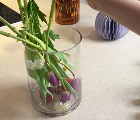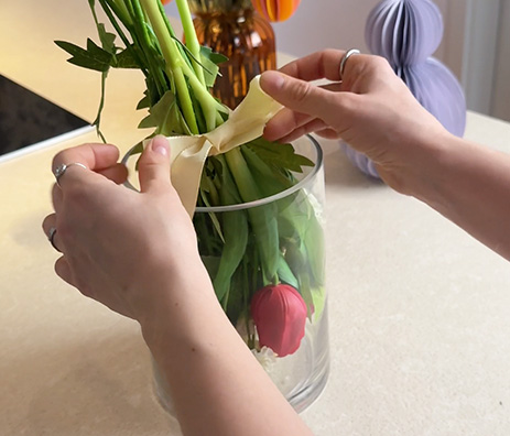 Lassen Sie die Blumen bis zum Verschenken in der Vase. So bleiben sie frisch und die beschenkte Person kann danach die Vase direkt für Ihren Blumenstrauß verwenden.