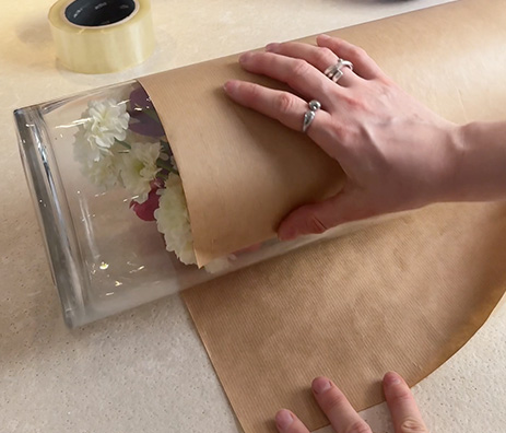 Nehmen Sie nun das durchsichtige Geschenkpapier und wickeln Sie es um die Vase. Achten Sie darauf, dass das Papier am oberen Rand bündig mit der Vase abschließt und nach unten hin etwas übersteht.