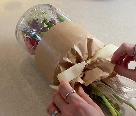 Fixieren Sie den Strauß mit einem Geschenkband, sodass alles gut zusammenhält.