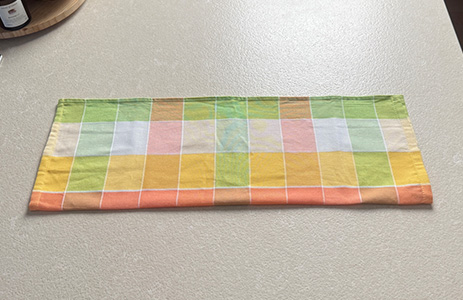 Legen Sie ein sauberes Geschirrhandtuch glatt vor sich auf den Tisch und falten es an der langen Seite in der Mitte nach oben.