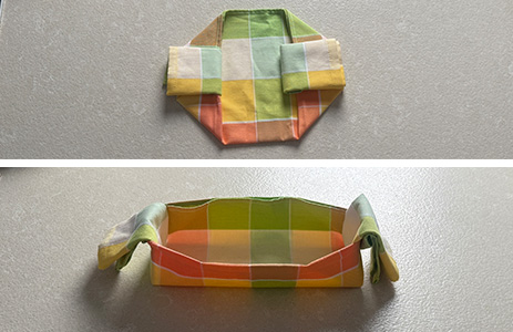 Klappen Sie anschließend die beiden Enden nach außen, bis sich das Tuch von alleine wie ein Korb aufstellt.