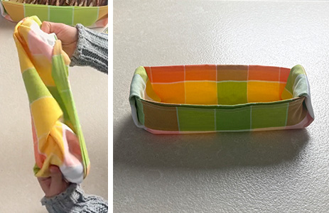 Zum Schluss die Enden festhalten und das gesamte Tuch nach innen umstülpen, umdrehen und den Korb hinstellen. Fertig!