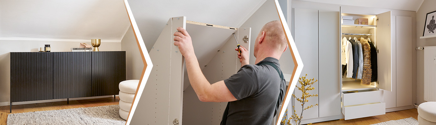 Claudia: "Durch Dachschrägen oder enge Räume ist es nicht einfach, das richtige Möbelstück zu finden. Es ist sehr praktisch, dass Höffner einen umfangreichen Konfigurator anbietet, bei dem ich mein Wunschprodukt ganz individuell und genau nach Maß anfertigen lassen kann. Und es wird direkt von den Mitarbeitern bei mir aufgebaut, einfach klasse."