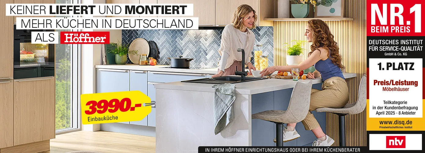 Bei der Planung einer neuen Küche gibt es viel zu bedenken. Gut, wenn Sie mit Höffner einen erfahrenen Küchenprofi an seiner Seite hat. Denn keiner liefert und montiert mehr Küchen als Höffner. Unsere Küchenberater planen mit Ihnen Ihre neue Küche ganz nach Ihren individuellen Wünschen, Ihren Stauraum-Bedürfnissen und maßgeschneidert auf jede Raumsituation. Dabei können Sie wählen zwischen einer Beratung im Küchenstudio in einem unserer Möbelhäuser in Ihrer Nähe oder auch direkt bei Ihnen zu Hause. Vereinbaren Sie doch gleich Ihren persönlichen Wunsch-Termin. Wir freuen uns auf Sie!