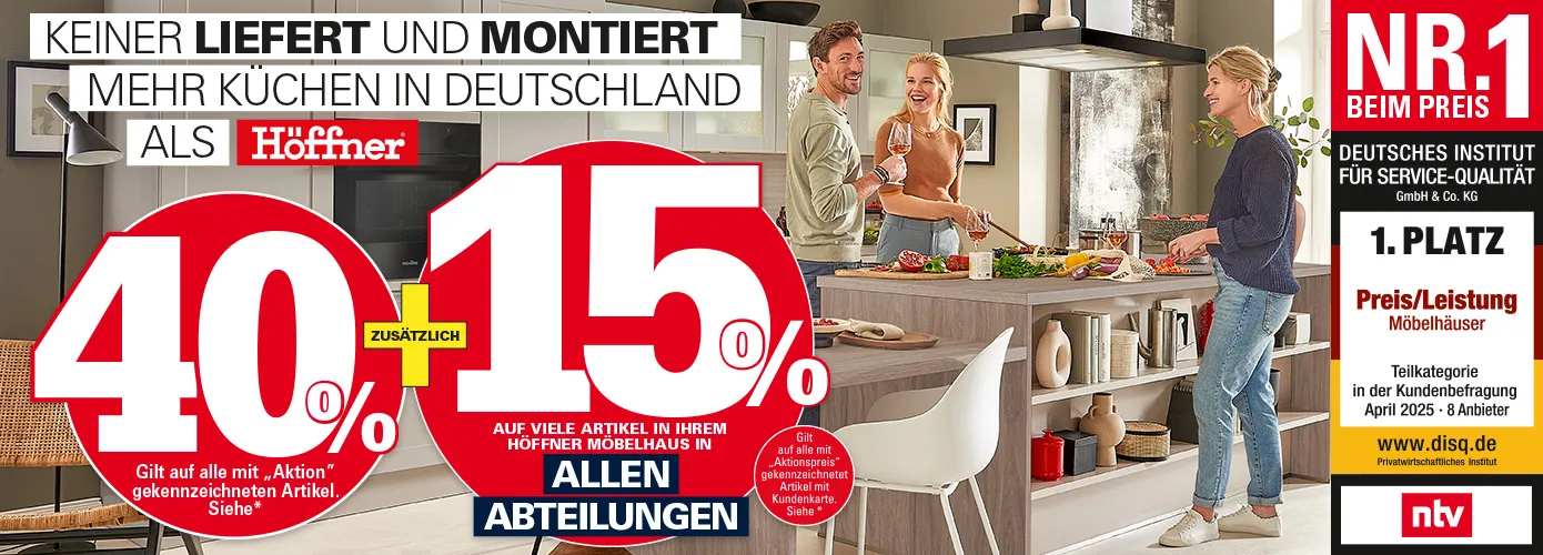 Ob Sie Fan vom gemütlichen Landhaus-Look sind, oder Ihr Herz für eine grifflose Küche schlägt – mit Höffner ist alles möglich. Frontdekor, Farbe, Arbeitsplatte, Armatur und viele mehr können Sie ganz nach Ihren persönlichen Wünschen anpassen. Unsere Küchenberater planen mit Ihnen zusammen, eine moderne Küche – das heißt: mit modernster Innenausstattung und durchdachten Komfort-Funktionen. So macht das Kochen noch mehr Spaß!