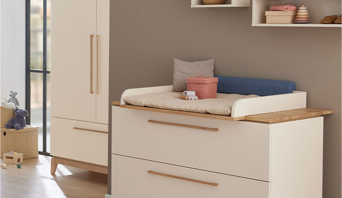 Ebenso wichtig wie das Bett, ist auch die Wickelkommode. Die Modelle von PAIDI lassen sich mit einem schraubenlosen Wickelaufsatz ergänzen. Wächst das Kind aus dem Windelalter heraus, nehmen Sie den Wickelaufsatz einfach von der Kommode und schon haben Sie ein cleveres Stauraummöbel.