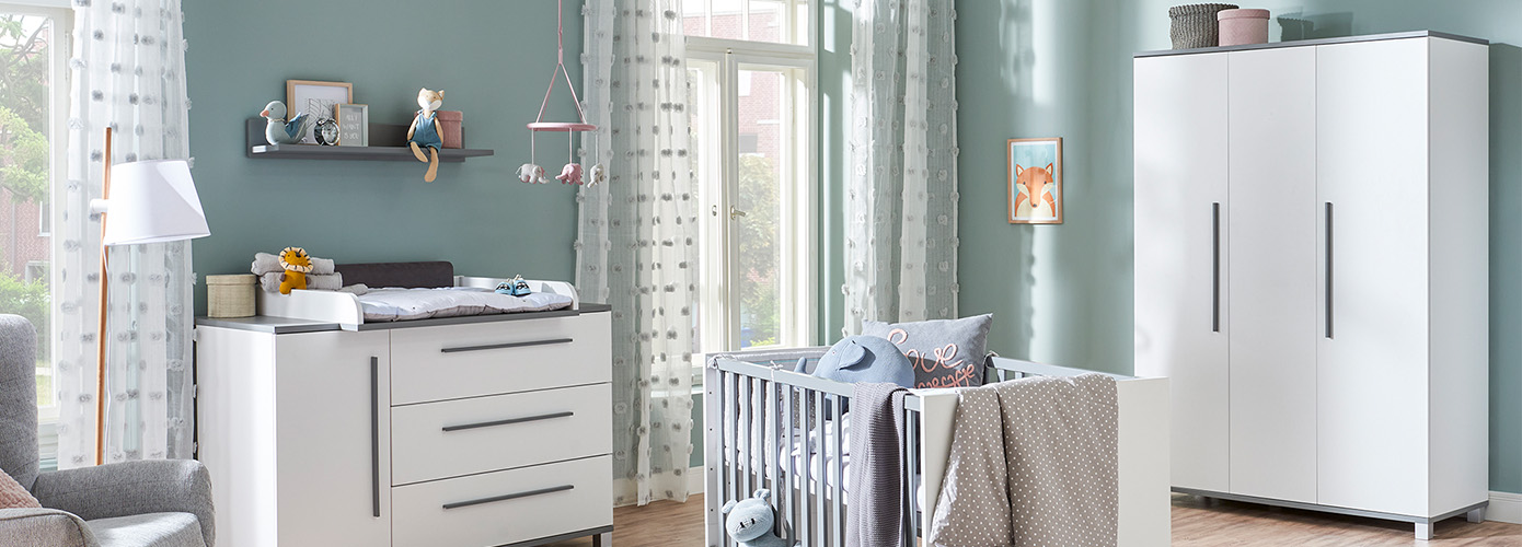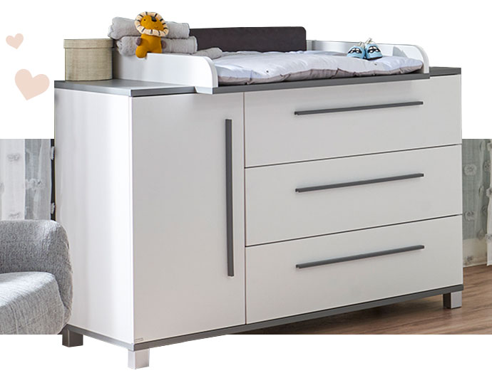 Ebenso praktisch ist die Kommode Kalea, die zunächst mit dem passenden Wickelaufsatz ergänzt wird. Später kann dieser rückstandslos entfernt werden, da der Aufsatz komplett ohne Schrauben auskommt. Weiteren Stauraum bieten der Schrank und die Regale der Serie. Übrigens: Für flüsterleises Schließen sind alle Türen und Schubladen mit einer Soft-Close-Funktion ausgestattet.