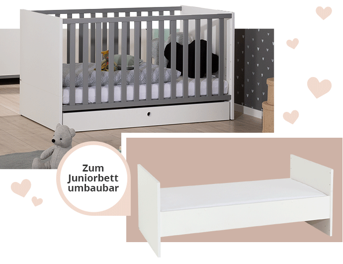 Wichtigstes Möbel ist das Kinderbett. Daher wird das Modell Kalea nicht nur mit einem speziellen AIRWELL-Comfort-Lattenrost geliefert, dieser lässt sich auch 4-fach in der Höhe verstellen. Zwei entfernbare Schlupfsprossen gehören ebenfalls zur Ausstattung des Bettes. Werden keine Gitterbettseiten mehr benötigt, können Sie das Kinderbett mithilfe der Umbauseiten zum Juniorbett umwandeln.