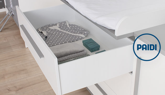 Weniger ist mehr: Die Babymöbel Kalea von PAIDI punkten mit ihrem geradlinigen, dezenten Design. Korpus und Fronten sind kreideweiß und werden von Akzenten in Schiefergrau kontrastiert. Dank ihrer strapazierfähigen Melaminbeschichtung, stabilen Verarbeitung und verschiedenen Umbaumöglichkeiten können Sie die Möbel langfristig nutzen – und zwar weit über das Baby- & Kleinkindalter hinaus.