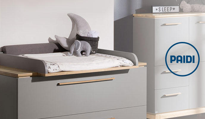 Eine hochwertige Qualität, durchdachte Funktionen und modernes Design: Die Babyserie Sten von PAIDI ist ein Highlight für das Babyzimmer. Das Babybett und die diversen Stauraum-Möbel sind mit einer robusten Melaminbeschichtung in Schiefergrau versehen, die die Oberflächen unempfindlich und pflegeleicht macht. Als natürlicher Akzent dienen die Absetzungen aus massiver, lackierter Eiche.