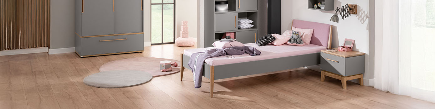 Damit Sie die Möbel weit über das Babyalter hinaus nutzen können, bestehen diese aus langlebigen Materialien, sind neutral designt und wachsen mit Ihrem Kind mit. So zum Beispiel das Babybett: Es verfügt über einen 4-fach verstellbaren Lattenrahmen und 2 der Gittersprossen lassen sich entfernen. Mit den separat erhältlichen Umbauseiten wird das Baby- später zum Juniorbett. Ein ergänzender Rausfallschutz ist ebenfalls erhältlich.