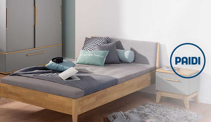 Neben den Betten gehören natürlich auch vielseitige Stauraum-Möbel zum Programm Sten: Ob Schrank mit Schiebe- oder Drehtüren, High- oder Lowboard, Regalen und mehr – Sie haben die Wahl. Zur bekannten PAIDI-Qualität gehören natürlich auch hochwertige Scharniere und Soft-Close-Ausstattungen für Türen und Schubladen.