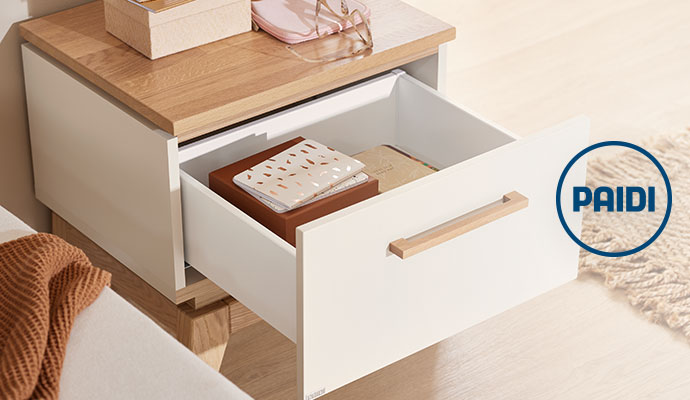 Mit seinem schicken und zugleich neutralen Skandi-Design ist das Programm Stiene von PAIDI ein Highlight für Kinder- und Jugendzimmer. Die Möbel sind in einem dezenten Cashmere-Beige gehalten und werden von Absetzungen aus Eichenholz bzw. in Eichenholz-Optik natürlich akzentuiert. Ein besonderer Blickfang sind dabei die spitzen Holzfüße im Retrostil der 50er- und 60er-Jahre.