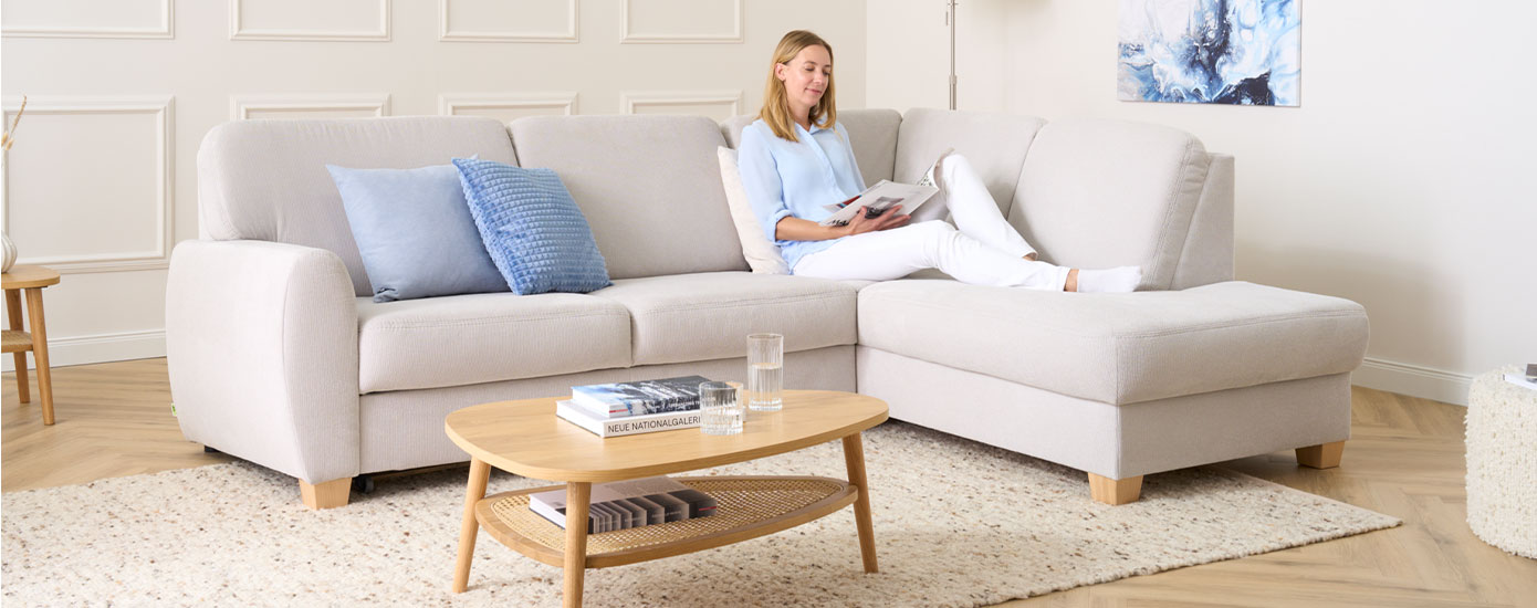 Ob Einzelsofa, Eckcouch oder Wohnlandschaft – alle Sofas sind optional mit Schlaffunktion erhältlich. Der geräumige Bettkasten bietet sich an, um Kissen, Bettdecke und Co. zu verstauen. Zusätzlich lassen sich auf Wunsch weitere Komfortausstattungen, wie Relaxfunktionen, ergänzen.