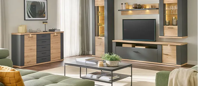 Praktisches, optional erhältliches Zubehör rundet das Möbelproramm gekonnt ab: Dazu gehören beispielsweise LED-Beleuchtungssets für Nischen oder Glaskanten der Vitrinen und spezielle TV-Aufsätze für die Lowboards und Kommoden. Übrigens: Die Schubladen der Möbel sind serienmäßig mit Soft-Close ausgestattet.