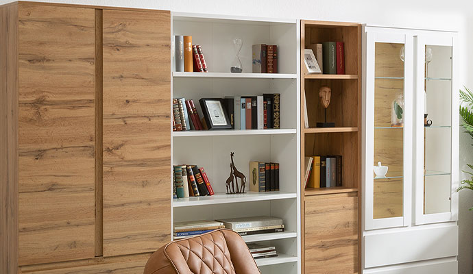 Die Kommoden der Serie gibt es in unterschiedlichen Breiten und Höhen. Auch farblich können Sie zwischen weiß und der effektvollen Kombination zwischen Weiß und einem warmen Holzton wählen. Die Tarent-Regale, der großzügige Mehrzweckschrank und das Lowboard dienen wunderbar als Ergänzung.