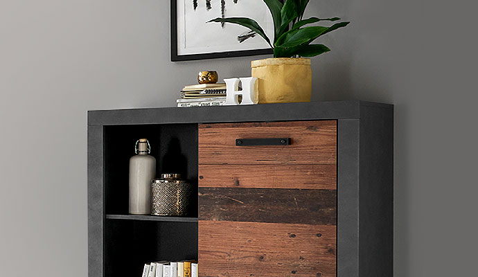 Die Serie Tavola präsentiert sich im coolen Industrial-Look. Altholzoptik mit Used-Effekt und unterschiedliche Holztöne schaffen einen einzigartigen Charakter. Der Korpus ist passend in Graphitgrau abgesetzt und verleiht Tavola kernigen Fabrikstil.