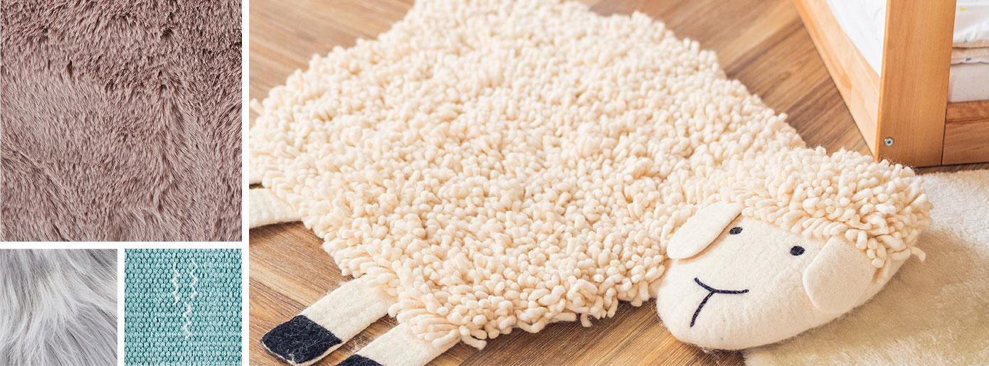 Je nachdem, wo der Teppich im Kinderzimmer liegt, kommen verschiedene Materialien in Frage. Direkt neben dem Bett sind besonders Hochflorteppiche oder Felle weich und angenehm. Als Untergrund zum Spielen sind Flachgewebe praktischer. Auf diesen kann man besser Türme bauen, Eisenbahnschienen verlegen oder puzzeln als auf weichem Hochflor. Da im Spielbereich auch manchmal gegessen und gekrümelt wird, sollte das Material außerdem möglichst pflegeleicht und bestenfalls sogar waschbar sein. Kunstfasern oder Baumwolle eignen sich hier hervorragend. Auch unter dem Schreibtisch ist ein flacher Teppich gut geeignet.