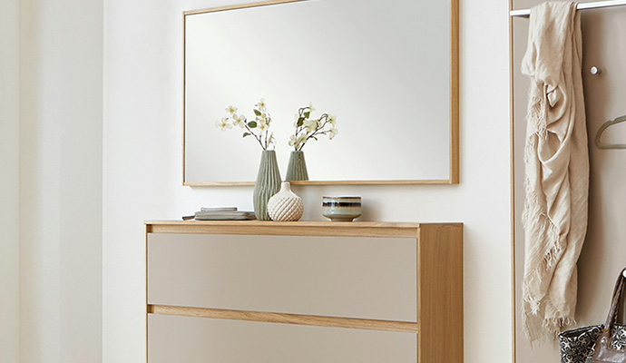 Hochwertiges Echtholz, feinste Lackfronten und eine puristische Formensprache – die Flurserie Tiba punktet mit ihrem eleganten Charme und Qualität Made in Germany. Für den Korpus der Möbel ist ausgesuchte Eiche Bianco verwendet worden – sowohl als Massivholz, als auch als Furnier. Die ebenmäßigen, grifflosen Fronten setzen sich wahlweise in Weiß oder Sand ab.