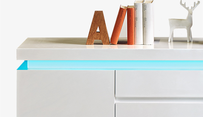 Torri bietet eine vielseitige Auswahl. Doch eins haben alle Modelle gemeinsam: Sie verfügen über jede Menge Stauraum. Für tolle Akzente sorgt die RGB-Beleuchtung. Sie befindet sich unterhalb der Abdeckplatte. Die energiesparenden LEDs steuern Sie einfach mit der mitgelieferten Fernbedienung und können so die Farbe anpassen.