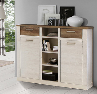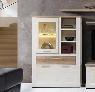 Holzdekore kommen nicht aus der Mode und bringen natürlichen Charme in den Raum. So wie die Serie Viareggio, die sich für Wohnzimmer und Essbereich anbietet. Die Möbel sind in Pinie Weiß (Nachbildung) designt und werden durch punktuelle Akzente in Eiche Antik (Nachbildung) abgesetzt.