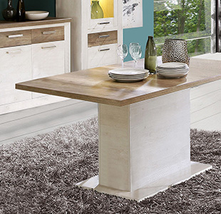 Als Mittelpunkt des Raumes bietet sich der große Esstisch in Säulenform an. Er ist mit einem Mittelauszug ausgestattet und kann auf 200 cm Länge ausgezogen werden. Ideal für sechs bis acht Personen.