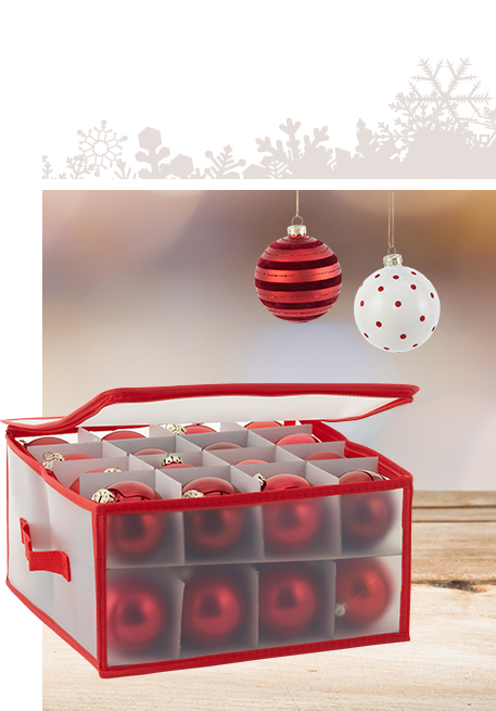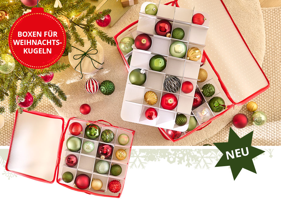 Mit unseren smarten Aufbewahrungsboxen sind Ihre Weihnachtskugeln sicher verwahrt. Praktische Einleger mit stabilen Trennkammern sorgen für einen sicheren Transport und Sie können so Ihre Kugeln nach Ihren Wünschen sortieren und verstauen. Ein weiteres Plus: Durch die transparenten Wände haben Sie auch gleich einen schnelleren Überblick Ihrer Weihnachtskugeln. Die kleinere Kugelaufbewahrungsbox umfasst bis zu 32 Kugeln, die Große kann bis zu 56 Kugeln verstauen.